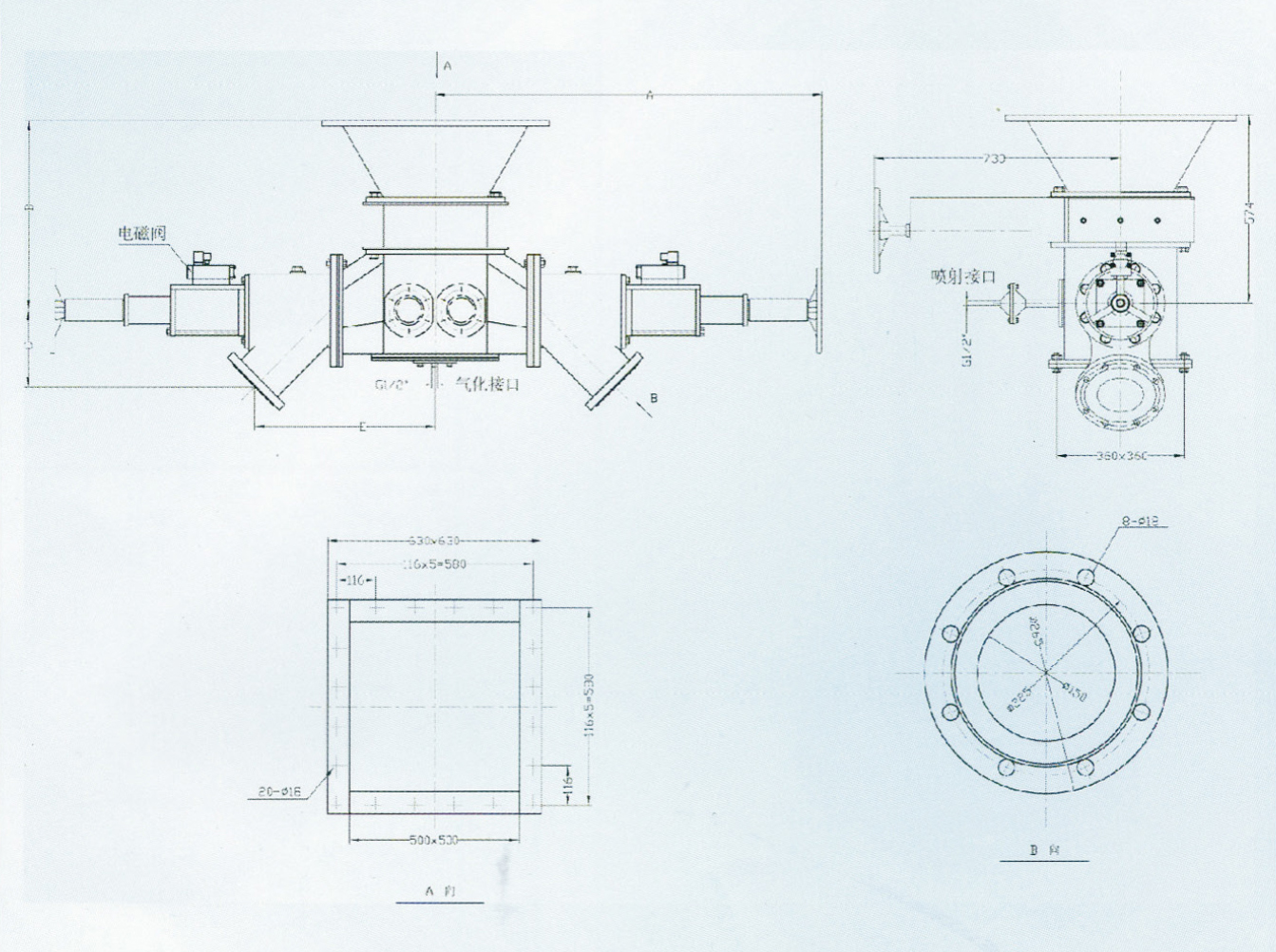 該設(shè)備用于粉料貯倉(cāng)底部或側(cè)面卸料用,設(shè)備帶有流化裝置,卸料時(shí)能使物料流態(tài)化排出,通過(guò)輸送管道或斜槽,配合散裝機(jī)直接裝料,該系統(tǒng)有氣動(dòng)和手動(dòng)兩種控制方式,氣動(dòng)用電磁閥控制氣缸伸縮運(yùn)動(dòng),實(shí)現(xiàn)卸料閥門(mén)的啟閉;手動(dòng)為轉(zhuǎn)動(dòng)手輪啟閉閥門(mén)。