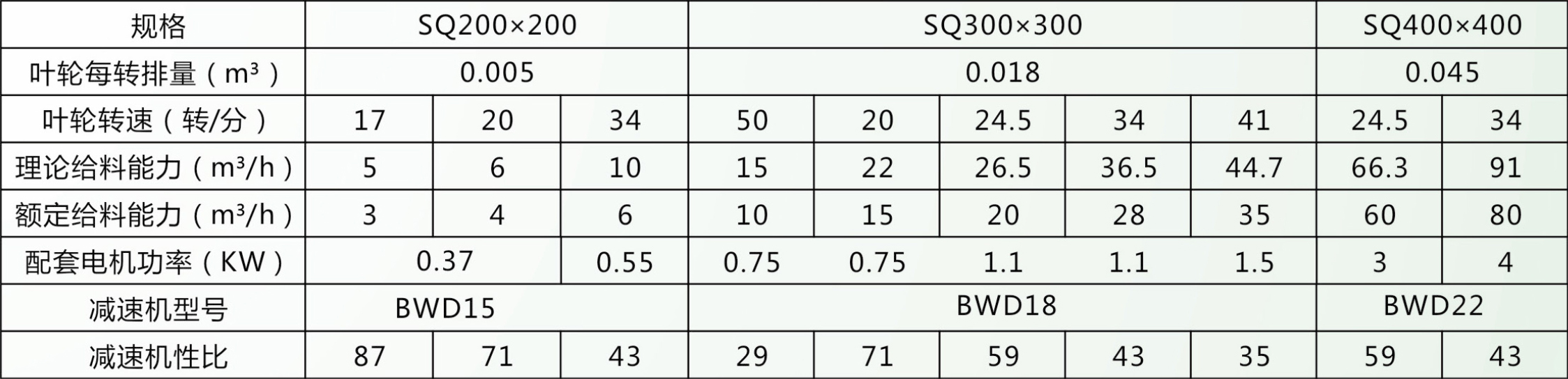本產(chǎn)品在結(jié)構(gòu)上分為A型和B型,A型為針輪擺線減速配用鏈條傳動(dòng),其技術(shù)參數(shù)見表一;B型為直聯(lián)式傳動(dòng),技術(shù)參數(shù)見表二,產(chǎn)品規(guī)格以口徑劃分,每種規(guī)格均給出幾種給料能力供選擇,如有特殊要求,可代為設(shè)計(jì)制造。